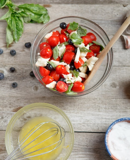 Combine the tomatoes, blueberries, mozzarella, and basil in a mixing bowl. Drizzle in a couple tablespoons of the vinaigrette and toss to incorporate. Add more vinaigrette if necessary. Serve immediately.