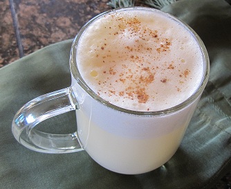 To each mug add 2 tablespoons brandy (or more to taste) and 1 large heaping tablespoon of egg mixture. Stir and fill mug with hot milk. Place another tablespoon of egg mixture on top and sprinkle with nutmeg.