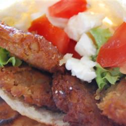4.Heat 1 inch of oil in a large skillet over medium-high heat. Fry patties in hot oil until brown on both sides. Serve two falafels in each pita half topped with chopped tomatoes and cucumber sauce.
