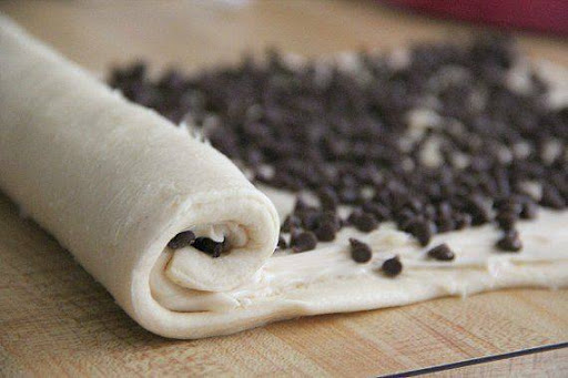 Sprinkle some mini chocolate chips on top of the cream and roll it up.