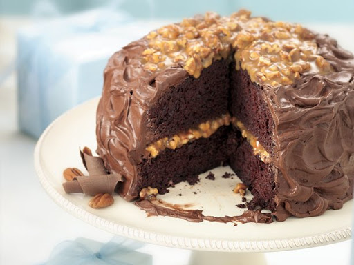 STEP 4 Place 1 cake layer on plate, round side down. Spread with 1 cup of the pecan filling. Top with second layer, round side up. Spread remaining pecan filling into 4- to 5-inch circle on top of cake. Spread chocolate frosting on rest of top and side of cake. Store loosely covered.