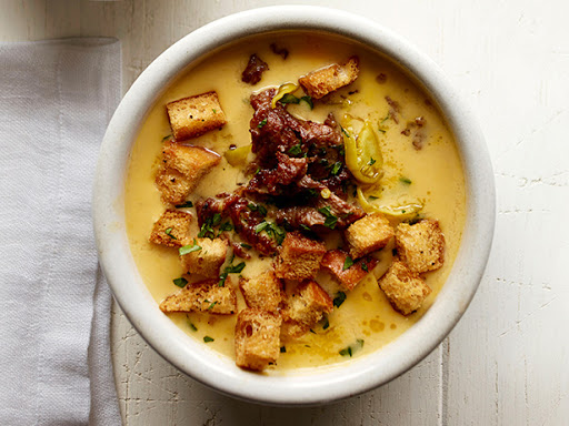 Puree the soup in a blender until smooth. Return to the pot and bring to a boil, then reduce the heat to medium low and simmer 5 minutes. Toss the cheddar, provolone and the remaining 2 tablespoons flour in a bowl; slowly whisk the cheese mixture into the soup until melted. Return to the blender and puree until smooth. Pour back into the pot and bring to a low boil; remove from the heat.