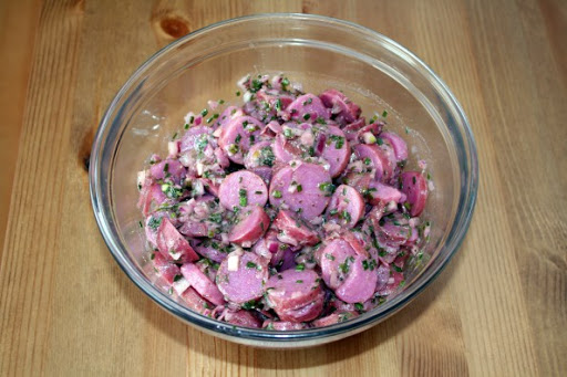 The best potato salad I’ve ever eaten was at Figlmueller in Vienna, Austria. Figlmueller’s Austrian potato salad had a luxuriously thick, velvety dressing with potatoes that practically melted in your mouth. It was glorious. All four of us travelling (Kathy, Rick, Ro and I) were obsessed with how good Figlmueller’s potato salad was. The recipe below actually comes from Figlmueller’s cookbook however I adapted it slightly since I didn’t have mache and I thought the original 1 whole red onion was far too much than what we ate in the restaurant. I also used small purple potatoes because a. they contain more antioxidants than normal white potatoes and b. I thought the color would be nice. I promise you won’t miss the mayo this Memorial Day!
