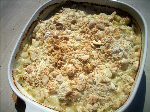 5. In a oven dich place the mix of chiken, cover with the crumble and bake until is golden. Take out the oven and serve.