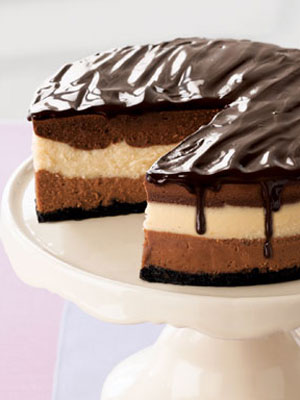 Divide the batter evenly (about 2 cups each) among 3 medium bowls. Melt the chocolates separately. Stir milk chocolate into 1 bowl of batter, white chocolate into another and semisweet chocolate into third. Spread milk chocolate batter in prepared crust in an even layer. Carefully spoon white chocolate batter over milk chocolate layer to cover; gently smooth with an offset spatula (do not let batters run together). Spoon semisweet chocolate batter over white chocolate layer to cover; smooth with an offset spatula (do not let batters run together).