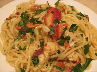 In a large, shallow pan, warm together the lobster cream and the lobster pieces over medium heat. Add the spaghetti and bacon and twirl all the ingredients around with a wooden spoon for 3 to 4 minutes to heat through. Garnish with the parsley and serve family style (turn on the TV and start arguing). Serves 2.