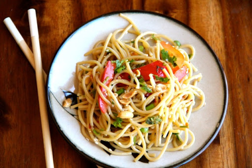 3.Add the drained spaghetti to a serving bowl. Pour dressing over hot noodles and toss to combine. Cover and refrigerate at least two hours, up to several hours, until chilled thoroughly and until the noodles have absorbed the flavors of the dressing. Just before serving, add cilantro, peanuts, green onions, bell pepper, and sesame seeds. Toss to combine and serve.