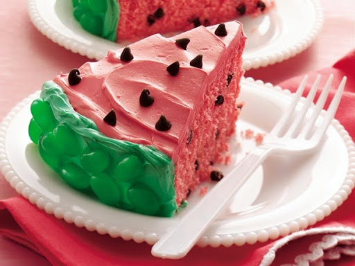 3. 3 In small bowl, stir 1 cup of the frosting with 10 to 12 drops green food color. Stir 10 to 12 drops red food color into remaining frosting. Frost sides of cakes with green frosting; press green jelly beans into frosting. Frost tops of cakes with red frosting; press remaining 2 tablespoons chocolate chips into frosting for seeds. If desired, cut cakes crosswise in half and arrange "slices" randomly on tray. To serve, cut into wedges. Store loosely covered at room temperature.