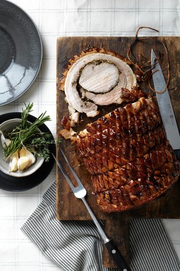 If you can't find a pork loin with belly flap attached, shop for a 5-pound boneless center-cut pork loin plus one 4- to 5-pound pork belly with skin attached. Recipe adapted from "All About Roasting: A New Approach to a Classic Art," by Molly Stevens.