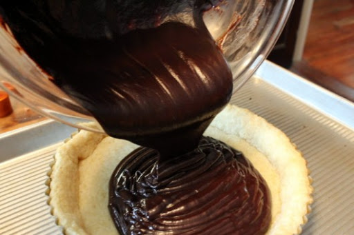 Place chocolate in bowl. In saucepot, scald cream and pour over chocolate. Whisk until smooth. Pour into crust. Chill in fridge.