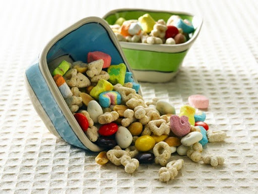 Use candy-coated chocolate candies for the peanut butter pieces and chocolate-covered raisins for the yogurt-covered raisins to make Chocolate Good Luck Snack.