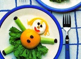 1. For each salad, place 1 peach half, cut side down, on 1 lettuce leaf on plate. Add celery sticks for arms and legs; marshmallow for head; raisins for eyes, nose, buttons, hands and feet; a piece of maraschino cherry for mouth; and shredded cheese for hair.
