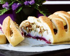 5. Cut diagonal strips about 1 inch (2.5 cm) wide and 3 inches (8 cm) long into the long ends. Crisscross strips over filling to get a braided look. Brush dough with oil and bake for about 30 minutes or until golden and crisp.