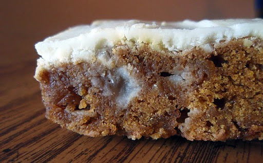 In a medium bowl, whisk together flour, spices, baking soda, and salt; set aside. With an electric mixer, cream butter and sugar on medium-high speed until smooth; beat in egg and vanilla until combined. Beat in pumpkin puree (mixture may appear curdled). Reduce speed to low, and mix in dry ingredients until just combined. Fold in 1 cup white chocolate chips. Spread batter evenly in prepared pan. Bake until edges begin to pull away from sides of pan and a toothpick inserted in center comes out with just a few moist crumbs attached, 30 to 40 minutes. Cool completely in pan.