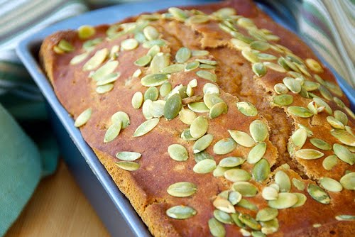 4. Add the flour mixture to the egg mixture and mix until just incorporated. Pour the batter into the pan. Sprinkle with pepitas. Bake for 60-75 minutes, or until the top is a deep golden brown and a cake tester inserted into the middle comes out clean. Check the bread about halfway through. If you feel like the top is getting too brown, then tent the pan with a piece of aluminum foil and continue baking. You can also place the pan on two stacked baking sheets in the center of the oven to prevent the bottom of the bread from getting too browned.