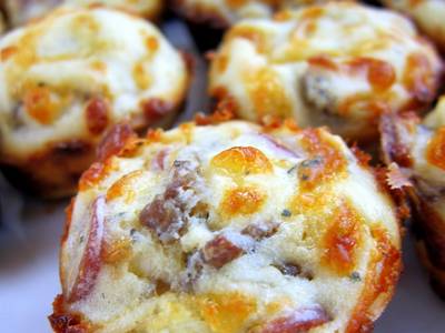 Pre-heat the oven to 375°. Grease a 24-cup mini-muffin pan. In a large bowl, whisk together the flour, baking powder, and garlic powder; whisk in the milk and egg. Stir in the mozzarella, sausage and pepperoni; let stand for 10 minutes.