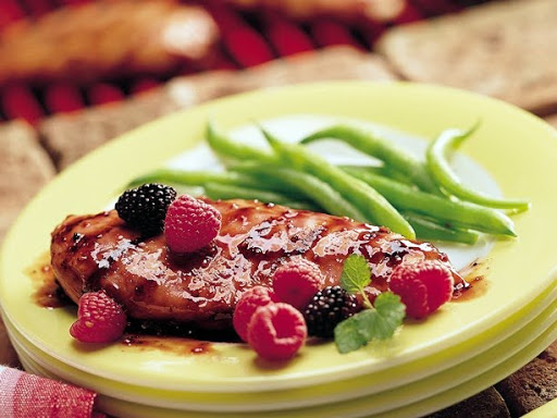 Cover and grill chicken 4 to 5 inches from medium heat 20 to 25 minutes, brushing occasionally with jam mixture and turning once, until juice of chicken is no longer pink when centers of thickest pieces are cut. Discard remaining jam mixture. Serve chicken topped with raspberries.