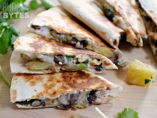 These quesadillas combine hearty chicken with sweet pineapple, spicy red pepper flakes (although you could use jalapeño instead, if you’d like), hearty black beans, fresh green onion and cilantro. The result is fresh, filling, gooey, and crispy all at the same time. This, my friends, is the magic of quesadillas.