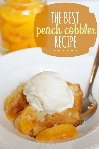 Take out the pan with the melted butter and pour batter/mixture over it. Also pour can of peaches (with the juice over it). Do not mix.