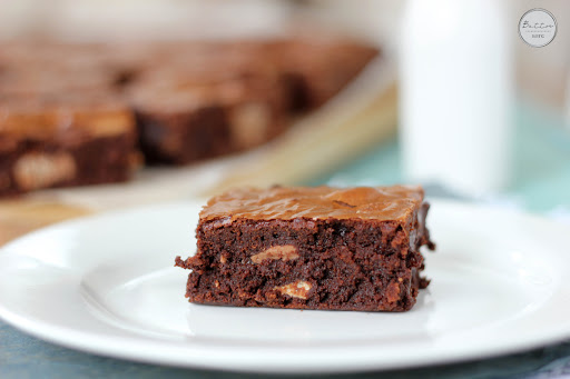 Pour half the batter into the prepared pan and spread out with a spatula. Scatter the chopped Kit Kat bars over the top. Pour the remaining batter over the chocolate chunks. Smooth out the top with a spatula.