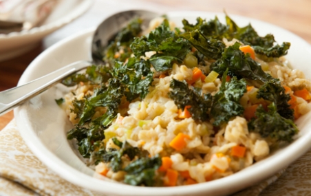 Heat remaining 4 teaspoons oil in a large saucepan over medium-high heat. Add chopped onion, carrots and celery, and cook 5 minutes or until softened, stirring occasionally. Stir in broth, 1 cup water, oats, salt and pepper, and bring to a boil. Reduce to a simmer and cook about 5 minutes or until oats are tender. Serve garnished with kale chips.