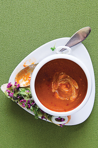 4. To serve, ladle soup into serving bowls; garnish with a swirl of crème fraîche.