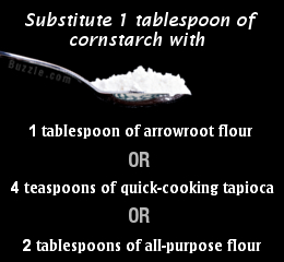 Four teaspoons of quick-cooking tapioca or two tablespoons of grainy tapioca can easily substitute for a single tablespoon of cornstarch.best choice for dishes that require chilling. It is also good for making high-acidic pie fillings (e.g., cherries) thick. However, avoid cooking it for too long as this doesn't stand overcooking at all.