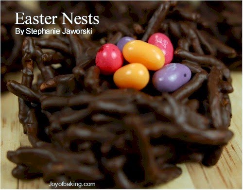 Place the pan, with the chocolate nests, in the refrigerator to set (about 30 minutes). Just before serving, remove the nests from the refrigerator and place some small jelly beans or other egg shaped candy in the center of each nest.