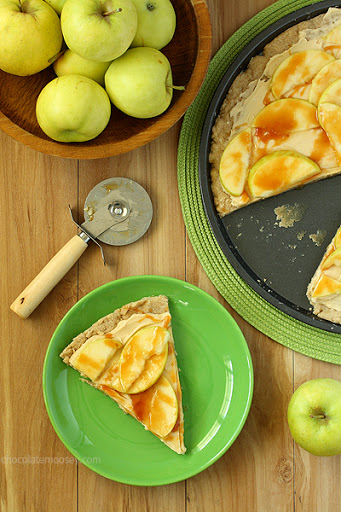1.In a large mixing bowl, beat together the butter, sugar, and salt until creamy and fluffy. Beat in the 1/4 cup caramel. Spread onto the cooled cookie pizza. Top with apple slices then drizzle 2 tablespoons caramel.
