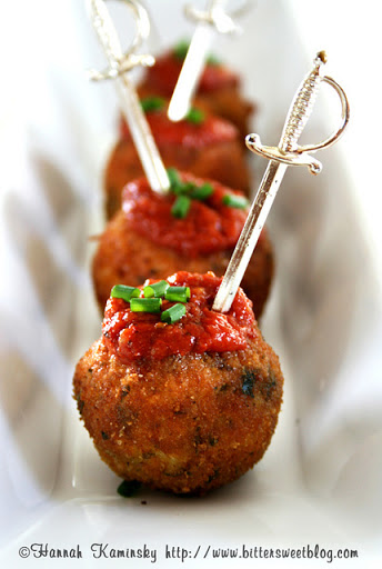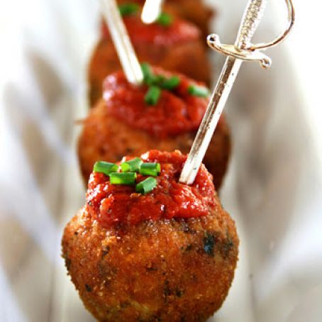Heat about 2 inches of oil in a high-sided sauce pan or skillet to about 350 – 375 degrees, and add in 3 – 4 rice balls at a time, depending on the size of the cooking vessel. Fry for about 1 minute on all sides, until evenly golden brown all over. Carefully remove finished arancini and let drain on wire racks briefly, until cool enough to handle. Repeat with the remaining rice balls. Serve as soon as possible, with marinara sauce and fresh herbs on the side, or spooned right on top.