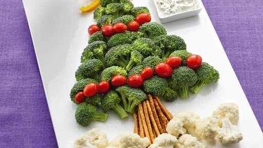 Arrange broccoli on serving platter to form tree shape and tomatoes to form garland. Arrange bell pepper to form star and cauliflower to form snow (see photo). If desired, cover and refrigerate up to 4 hours.