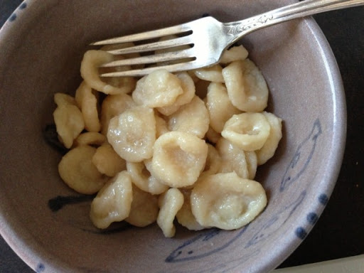 Unwrap the dough, and cut off a 3/4-inch thick slab. Loosely cover the dough so it doesn’t dry out until you’re ready to cut another slab off. Roll the slab of dough into a 1/2-inch thick rope on the unfloured counter top. Transfer the rope to the floured board, and cut off 1/2-inch thick coins. Arrange the bits of dough cut side up. Place the tip of a butter knife at the edge of the dough, and use a quick motion, pull the butter knife towards you. Use the tip of your forefinger to mold the pasta into shape, creating a “little ear”, which is the literal translation of orecchiette. In reality, I think it looks like a sombrero, just with a not-so-wide rim. Transfer the formed orecchiette to a rimmed sheet sprinkled with semolina flour, making sure to keep them single layer so they don’t stick together.