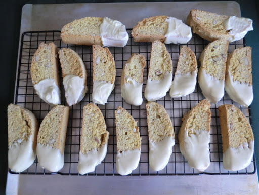 Melt the chocolate in a double a boiler. Dip one end of each biscotti in melted white chocolate, then lay it on the wire rack.