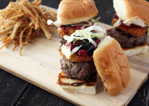 Beef Sliders with Fried Goat Cheese, Smashed Raspberries, and Balsamic