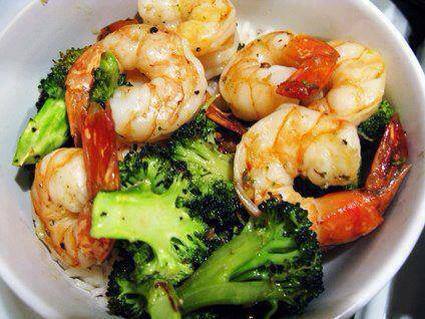 2. Meanwhile, toss together one pound large shrimp, shelled and deveined, with 2 Tbs olive oil, lemon zest from one lemon, 1/2 tsp salt and 1/2 tsp pepper (I just eyeball the salt and pepper) in a bowl. When the broccoli’s been in the oven 10 minutes, add the shrimp to the broccoli and toss (carefully.)