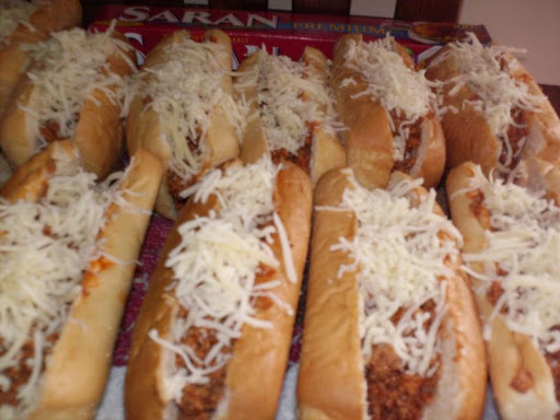 1.Add one and a half jars of pizza sauce to beef in skillet. Stir and cook on medium until bubbly. Slice each bun almost through and spoon beef mixture into the bun. Add cheese on top and seal with plastic wrap. Place in refrigerator and heat in microwave for one minute when ready to eat. Can be stored in fridge for several days.