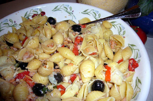 Rinse the cooked pasta in a sieve with some cool water. Toss the pasta with the shrimp, artichokes, & olives.