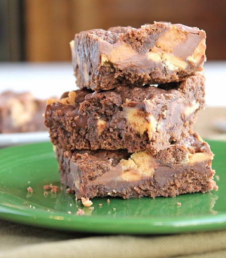 6. With remaining dough, drop by spoonfuls on top of Reese's peanut butter cups. Do not spread this out - pieces of the middle layer should peak through.
