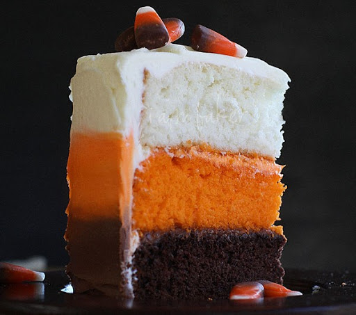 For the white and orange layers, simple prepare white cake batter as you normally would. Divide batter in half and tint one half orange. (Add orange extract if you wish)