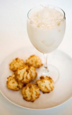 Strain into a glass filled with ice and garnish with toasted coconut shavings on top.