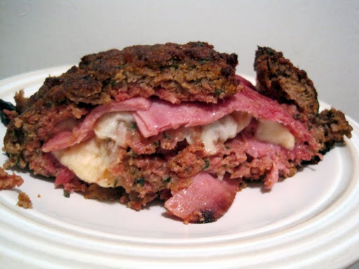 On wax paper form meat mixture into a 10×12″ rectangle. Line with ham and cheese. Roll and seal seam. Seal ends and seam well, otherwise the cheese will just ooze out all over the place. Place on a foil lined baking sheet and bake 1 hour 20 minutes at 350 degrees.