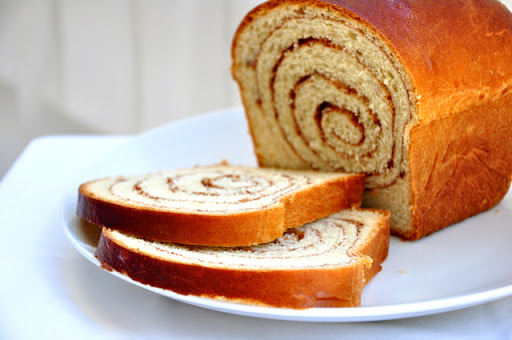 Turn dough out onto the work surface. Roll into a neat rectangle no wider than the loaf pan you’re going to use, and about 18 to 24 inches long. Smear with 2 tablespoons melted butter. Mix sugar and cinnamon together, then sprinkle evenly over the butter-smeared dough. Starting at the far end, roll dough toward you, keeping it tight and contained. Pinch seam to seal.