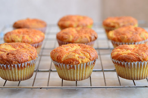 Using a scoop or spoon, fill paper-lined muffin cups to 3/4 full. Top with cheddar cheese and bake in a 350 F oven for about 20-25 minutes or until toothpick inserted comes out clean and top is golden. Allow to cool.