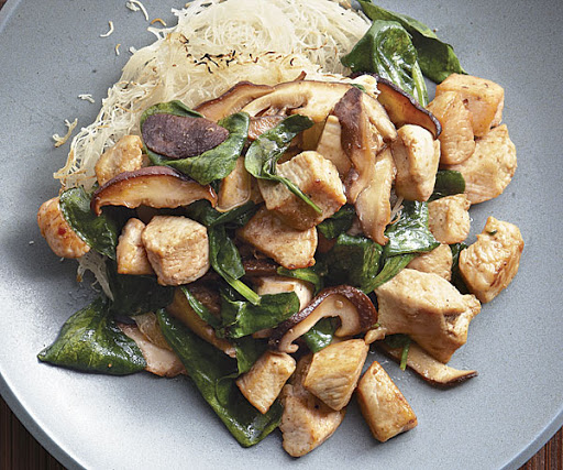 This recipe calls for dried rice vermicelli, the rice flour version of Italy’s classic thin pasta. Here, the cooked vermicelli is formed into cakes, pan-fried until crisp, and topped with a savory mixture of chicken, mushrooms, and spinach.