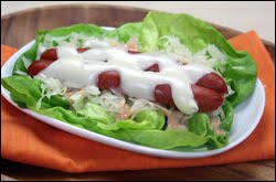 Reuben sandwich - bread + lots of lettuce - corned beef + guilt-free hot dog = nothing like any Reuben you've ever had before.