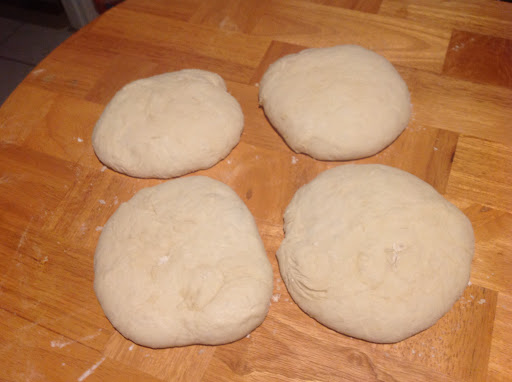 2) When the machine beeps at the end of the cycle, press Stop and unplug the machine. Immediately remove the bread pan from the machine and turn the dough out into a lightly floured work surface. Divide into the desired number of portions. Flatten each portion into a disc by kneading a few times then folding the edges into the center. Cover with a damp towel on the work surface to rest for 30 minutes until the dough has increased about 20% in size.