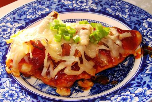 Cover Chicken breasts with bar-b-q sauce and bake until done, usually about 30 minutes (depending on the size of the breasts, it may take up to 45 minutes) in a 350 degree oven When chicken is done pour on more sauce, add bacon strips to cover the breasts and cover with cheddar cheese, return to oven until cheese melts.
