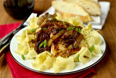 Turn heat to low then add remaining 2 Tablespoons balsamic vinegar, chicken broth, and honey to the skillet. Simmer for 1-2 minutes or until sauce is thickened then spoon over chicken and serve. I plated the chicken and sauce over cooked egg noodles.
