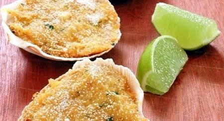 Coloca el relleno de siri en 10 conchas de vieras o de cangrejo pequeño. Coloca encima el queso parmesano rallado y previamente mezclado con la harina, rocía con aceite de oliva.