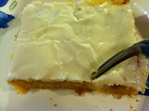 5.Once cake is out of the oven, combine the powdered sugar, three tablespoons of melted butter, vanilla, and milk. Whisk together until smooth. Drizzle over warm cake and spread evenly with the back of a spoon. Let frosting set before serving.